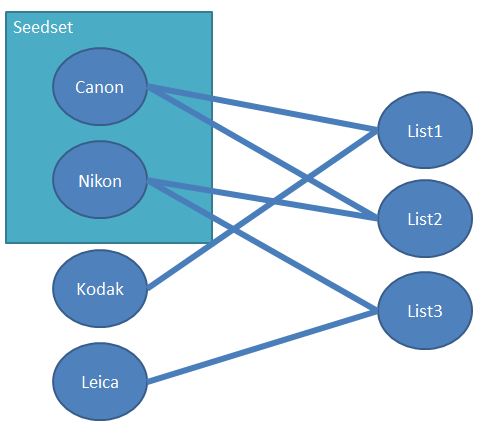 On the left side of this bipartite graph are the so called “candidate terms”, the seedset we provide should be a subset of them. The nodes on the right are called the context nodes, they are representing the link between the candidate terms. In the case of the paper, they have crawled the internet for list items and created an edge to a candidate term if it exists in a given list. The neigbours of a context nodes, are the actual list items in this case. In the case of the web, the picture should also contain words that are not digital camera brands, also think about this simple rule: “more data wins”. As in every normal graph, you can also weight the edges, for example if you trust the list data from wikipedia more than of craigslist, then you should assign a higher weight the edges between the context nodes and their candidate term nodes.
